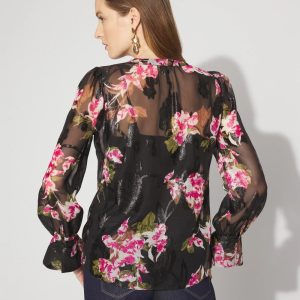 A romantic blouse with ruffles cascading down one side of the neck and down the front, with flounce cuffs. A metallic clip throughout gives you a touch of sheen. This blouse is sheer, so pair it with your favorite WHBM FORME™ or camisole.