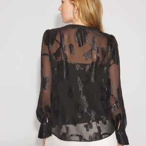 A romantic blouse with ruffles cascading down one side of the neck and down the front, with flounce cuffs. A metallic clip throughout gives you a touch of sheen. This blouse is sheer, so pair it with your favorite WHBM FORME™ or camisole.