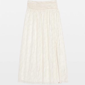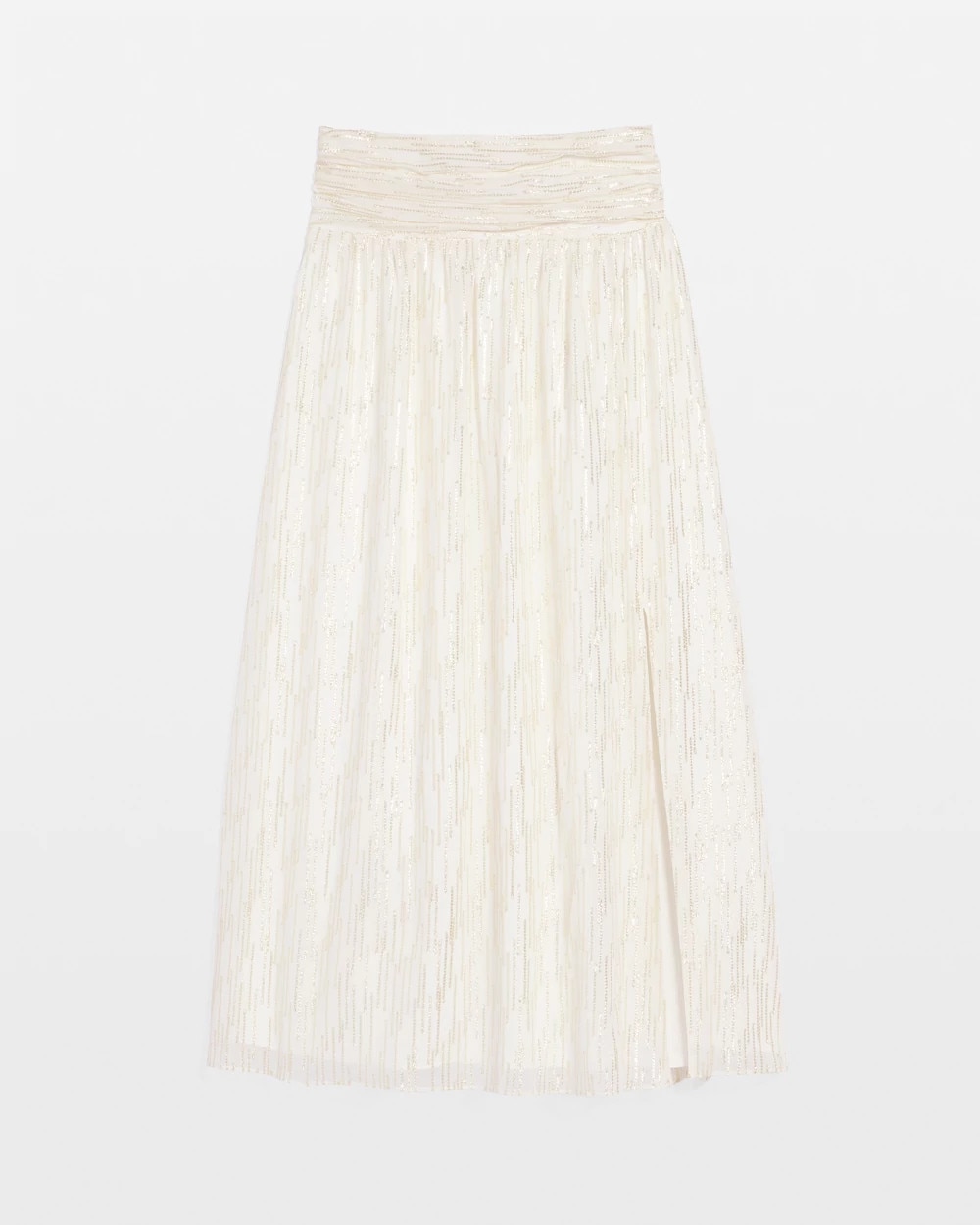 A flowy, romantic maxi skirt with a front slit, smocking in back and a shirred waistband. A gold lurex clip throughout adds subtle shine for an on-trend yet timeless look. Wear with a fitted WHBM FORME™ or tee.