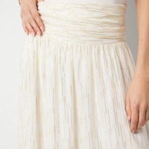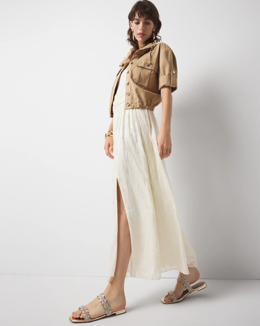 A flowy, romantic maxi skirt with a front slit, smocking in back and a shirred waistband. A gold lurex clip throughout adds subtle shine for an on-trend yet timeless look. Wear with a fitted WHBM FORME™ or tee.