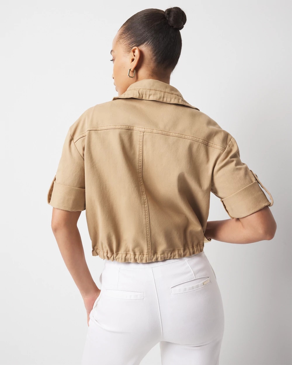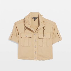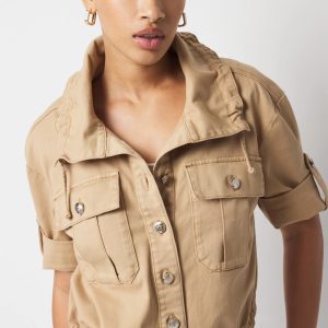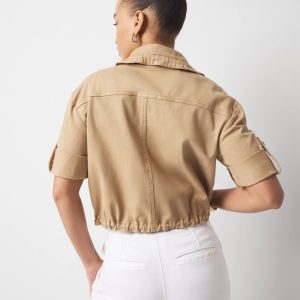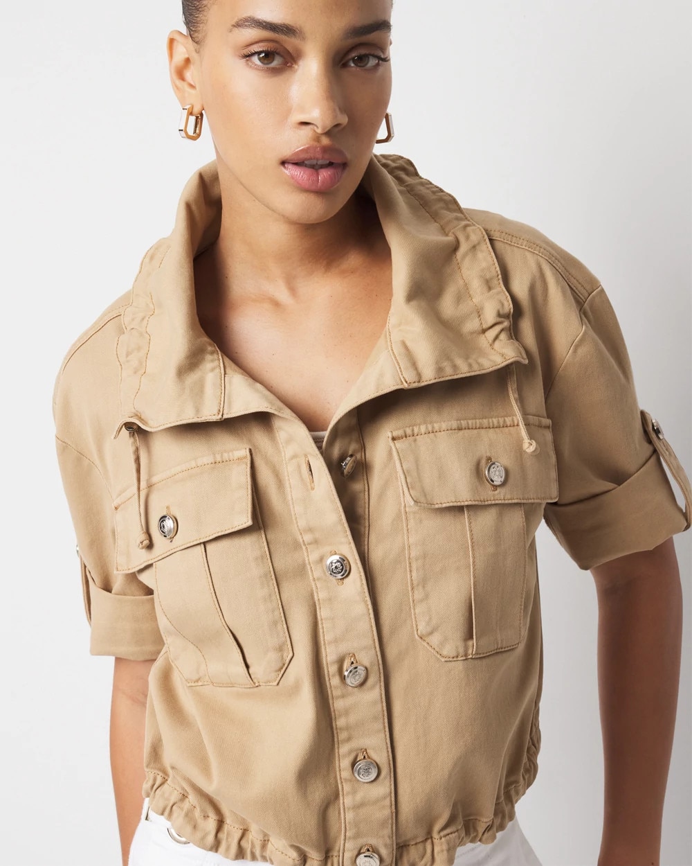We’ve designed a short-sleeve version of our Pret relaxed utility jacket for cool summer nights. Two oversized cargo pockets on the front with buttons, shoulder epaulets, tabs on the cuffs and a high funnel collar give this casual jacket extra style. A drawstring at the waist and neck allows you to cinch as relaxed or tight as you wish.