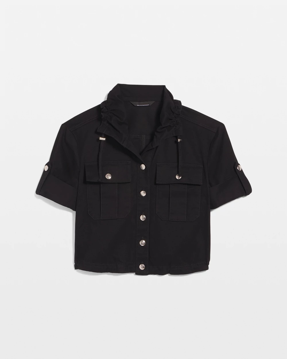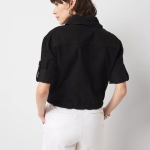 We’ve designed a short-sleeve version of our Pret relaxed utility jacket for cool summer nights. Two oversized cargo pockets on the front with buttons, shoulder epaulets, tabs on the cuffs and a high funnel collar give this casual jacket extra style. A drawstring at the waist and neck allows you to cinch as relaxed or tight as you wish.