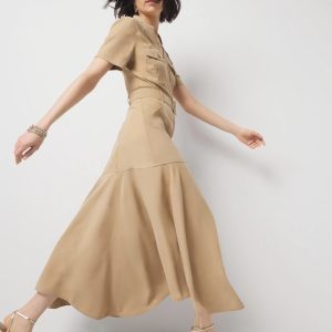 Made from a soft twill fabric with a flattering drape, this utility shirt dress has seaming details in the skirt and an asymmetric hemline. The chest pockets and front buttons are fully functional, and the removable belt has a self-covered buckle. A great casual dress to wear to the office with heels.