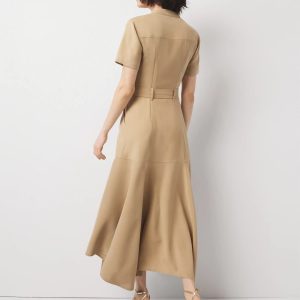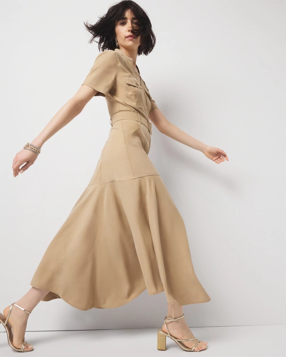 Made from a soft twill fabric with a flattering drape, this utility shirt dress has seaming details in the skirt and an asymmetric hemline. The chest pockets and front buttons are fully functional, and the removable belt has a self-covered buckle. A great casual dress to wear to the office with heels.