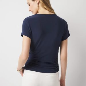 This fashion forward matte jersey top is designed with metal hardware detail at the draped neckline that evokes the best of 70s fashion as well as side seam shirring to create a luxe look. Pair with a pencil skirt or slim jeans or pants.