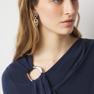 This fashion forward matte jersey top is designed with metal hardware detail at the draped neckline that evokes the best of 70s fashion as well as side seam shirring to create a luxe look. Pair with a pencil skirt or slim jeans or pants.