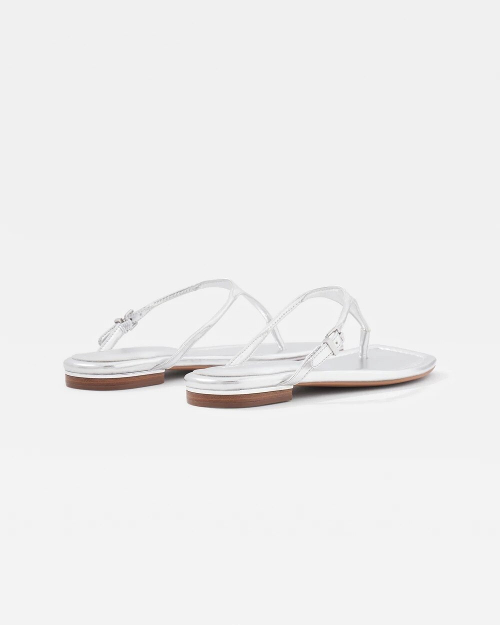 Glam up your summer wardrobe with this silver metallic flat sandal. An easy everyday slide that will work with all your dresses, shorts and jeans.