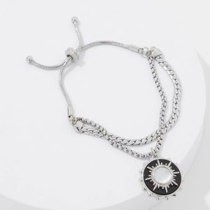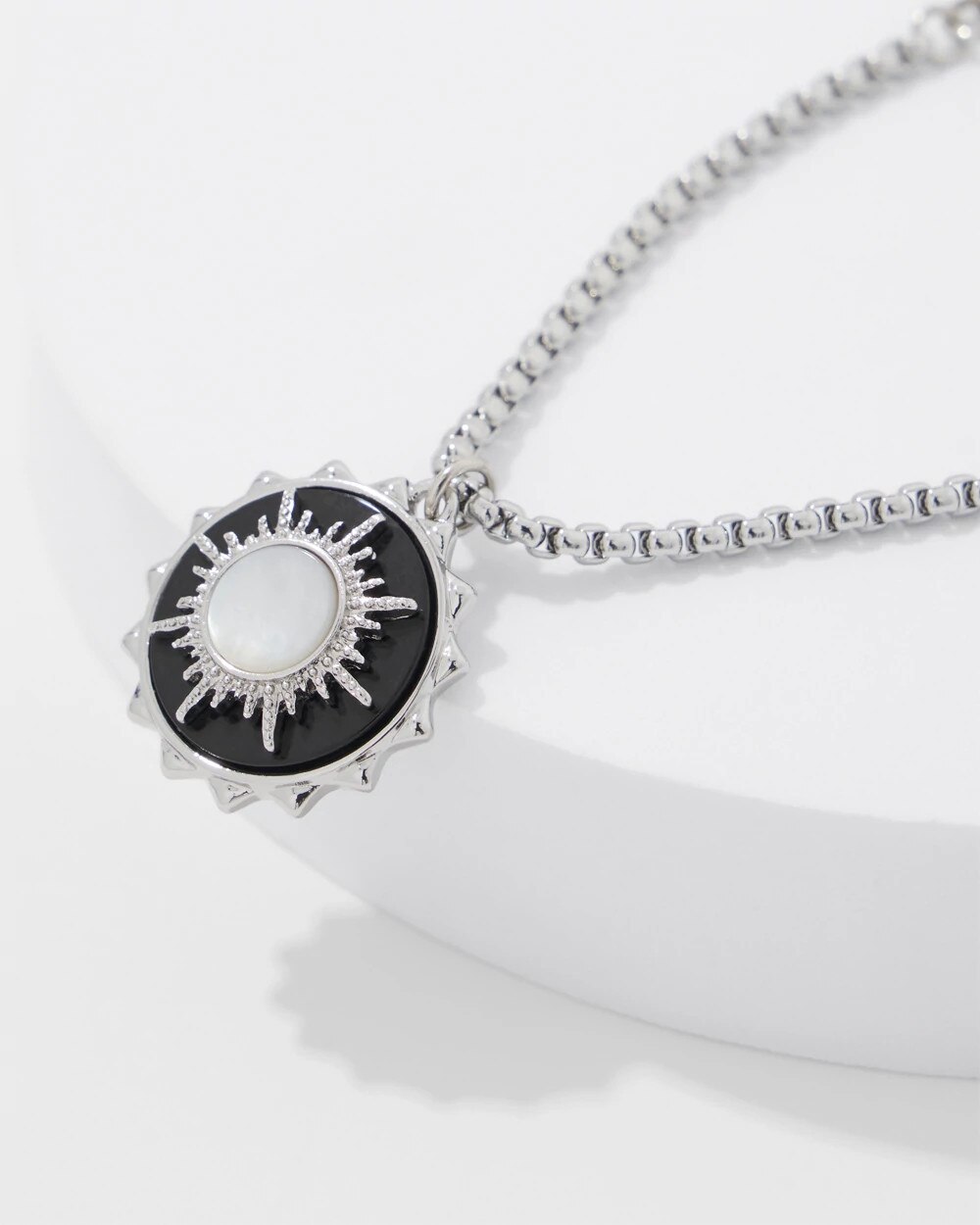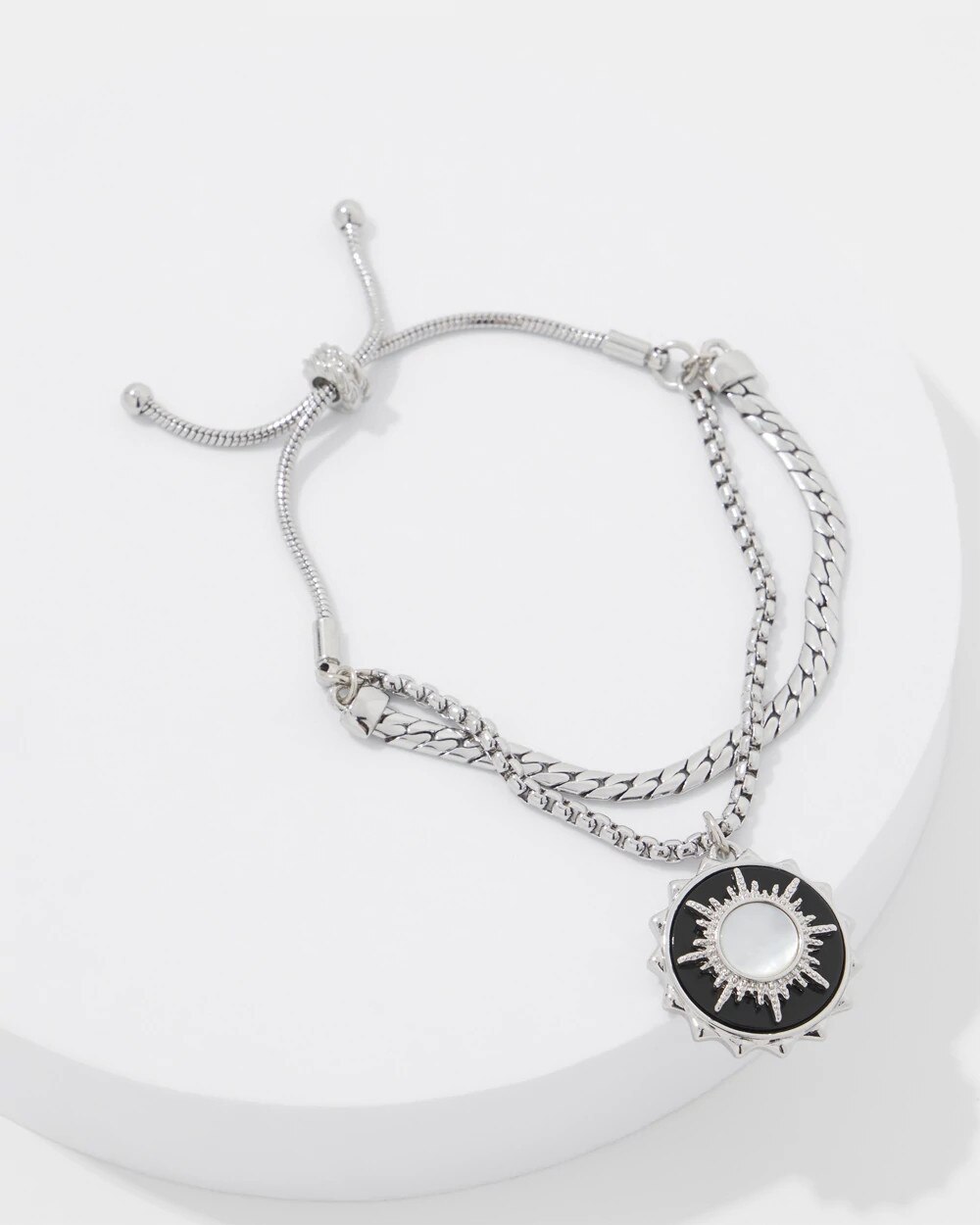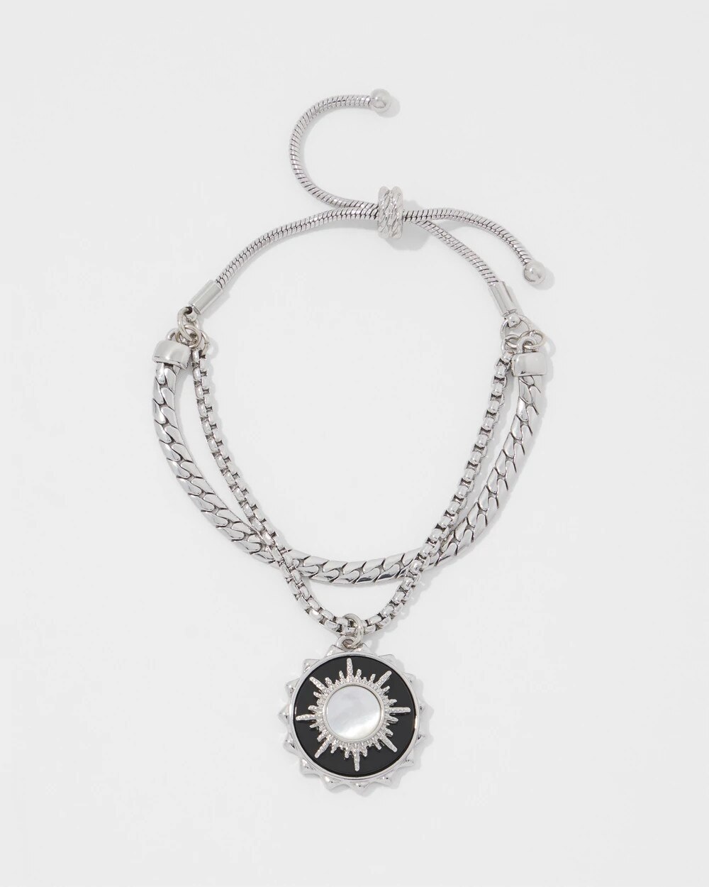 The sunburst charm has genuine onyx and shell details and a silver chain with friendship closure. This bracelet can extend 2” making it an easy piece to wear. Pair with matching necklace and earrings from the Black Charms Collection.