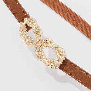 This skinny waist belt is a great way to add extra style to your dresses or long shirts. Designed with a shiny gold buckle with a twisted rope detail that forms the front hook closure.