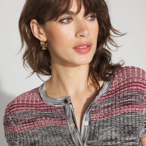 Crafted from space-dyed yarn to create a multi-colored pattern, this cap sleeve cardi has a grosgrain placket and soft gold snaps for closure. Try it with the matching Space-Dyed Tank Top.