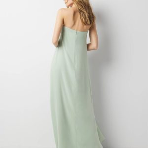 A timelessly chic silhouette, the strapless gown is draped throughout the body, eluding to old Hollywood glamour. The subtle sweetheart neckline calls for a shimmering necklace.