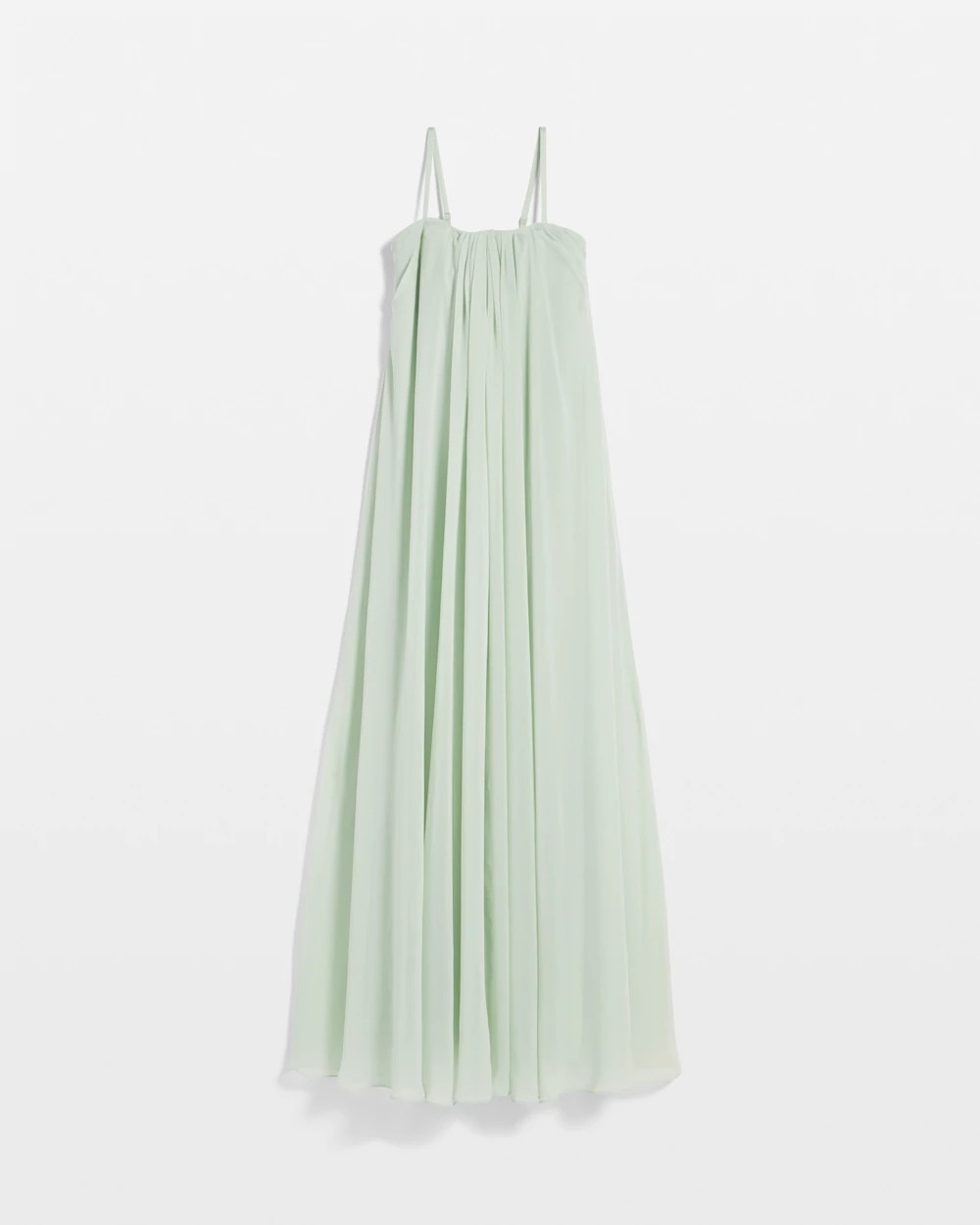 A timelessly chic silhouette, the strapless gown is draped throughout the body, eluding to old Hollywood glamour. The subtle sweetheart neckline calls for a shimmering necklace.