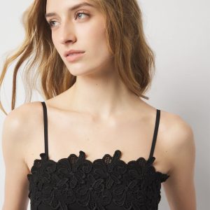 This jumpsuit has a stunning floral lace applique on the neckline. The bustier top has boning and gripper tape for a secure hold and great fit, and the straight leg pant is an easy leg shape to style with your shoe of choice.