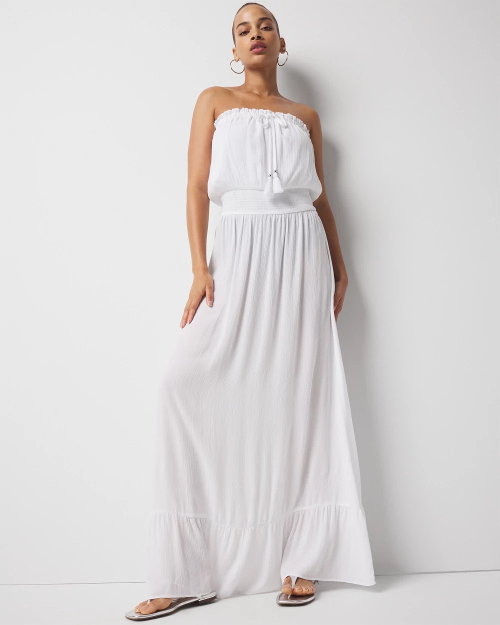 Up the style factor at the beach with this strapless maxi dress coverup. Made from a crinkle fabric that’s lightweight + sheer, it’s designed with an easy to wear elastic waist and a wide ruffle hem. Metal ends and tassels dress up the ties at the bustline.