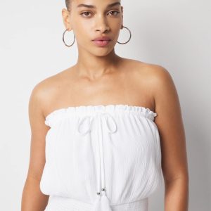 Up the style factor at the beach with this strapless maxi dress coverup. Made from a crinkle fabric that’s lightweight + sheer, it’s designed with an easy to wear elastic waist and a wide ruffle hem. Metal ends and tassels dress up the ties at the bustline.