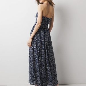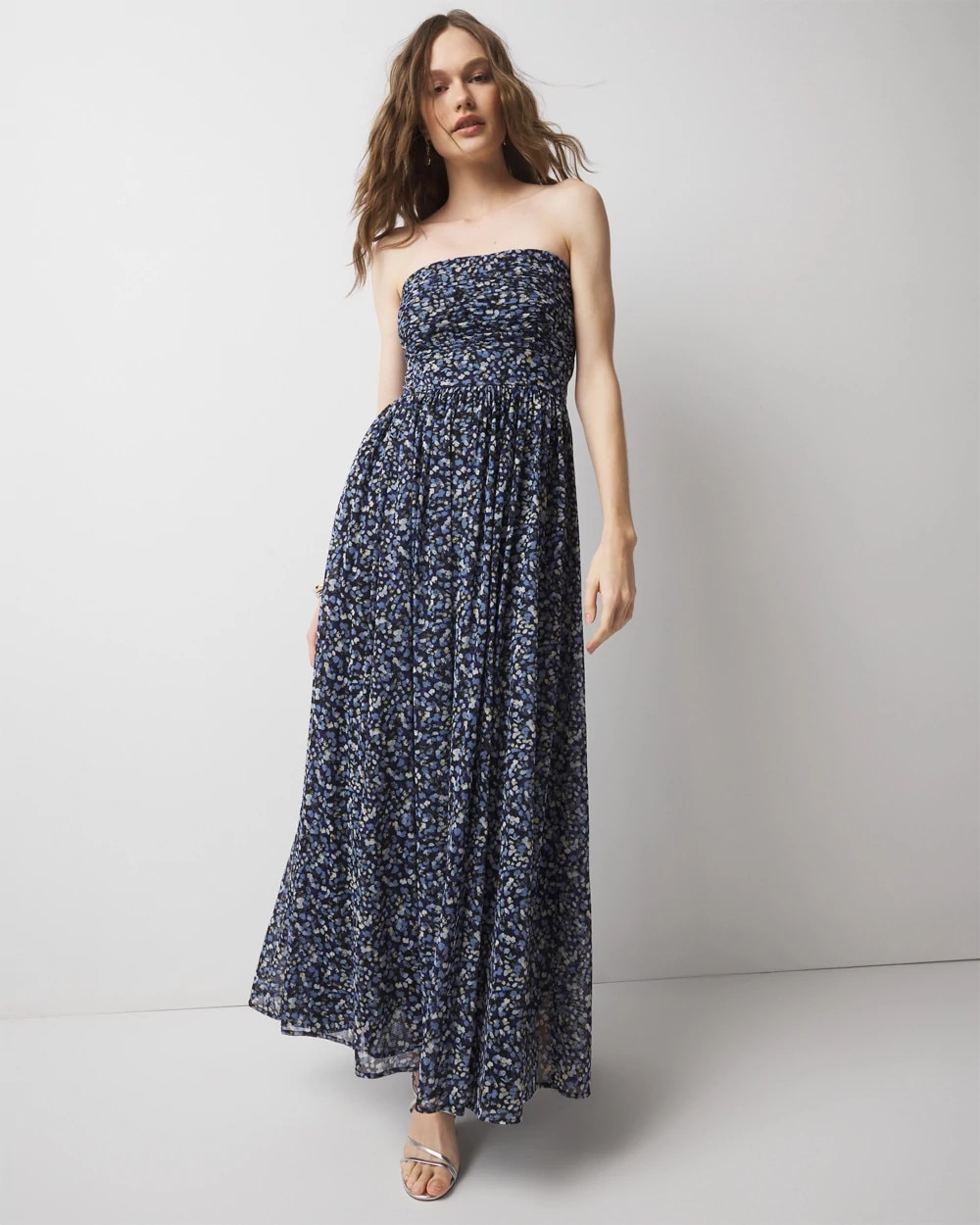 Our mesh fabrics are soft, cool, and fully lined. The ruching on this strapless maxi dress create an ultra-feminine silhouette that will take you anywhere this season.