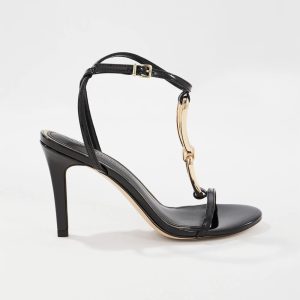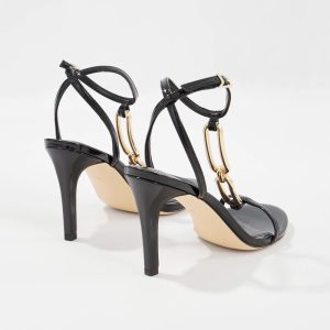 Crafted from black patent faux leather, these high-heel sandals have an elongated gold chain detail across the upper and a side buckle.