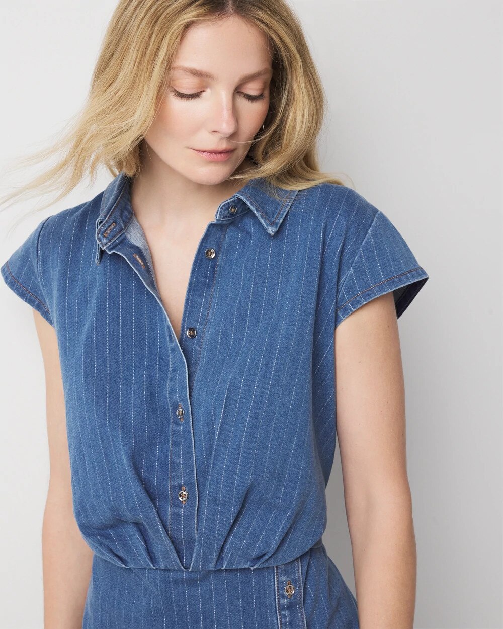 We’ve taken a classic sheath dress silhouette and updated it in denim. But not just any denim, we used a pinstriped lurex fabric as a subtle nod to the ongoing menswear trend. We also added two functional buttons at the top and a twist front detail to define the waist. A great look for the office or weekend brunch.