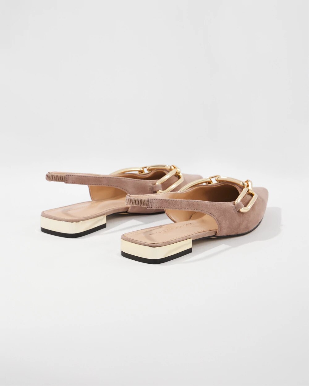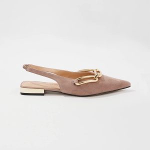 Fashioned from genuine leather suede, this classic slingback is adorned with gold elongated chain links. The taupe shade is a true neutral, making it easy to pair with your wardrobe.