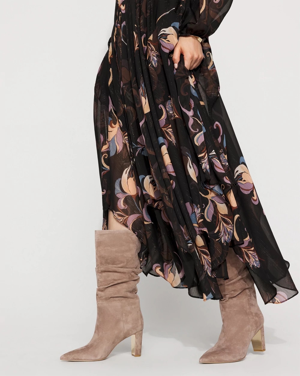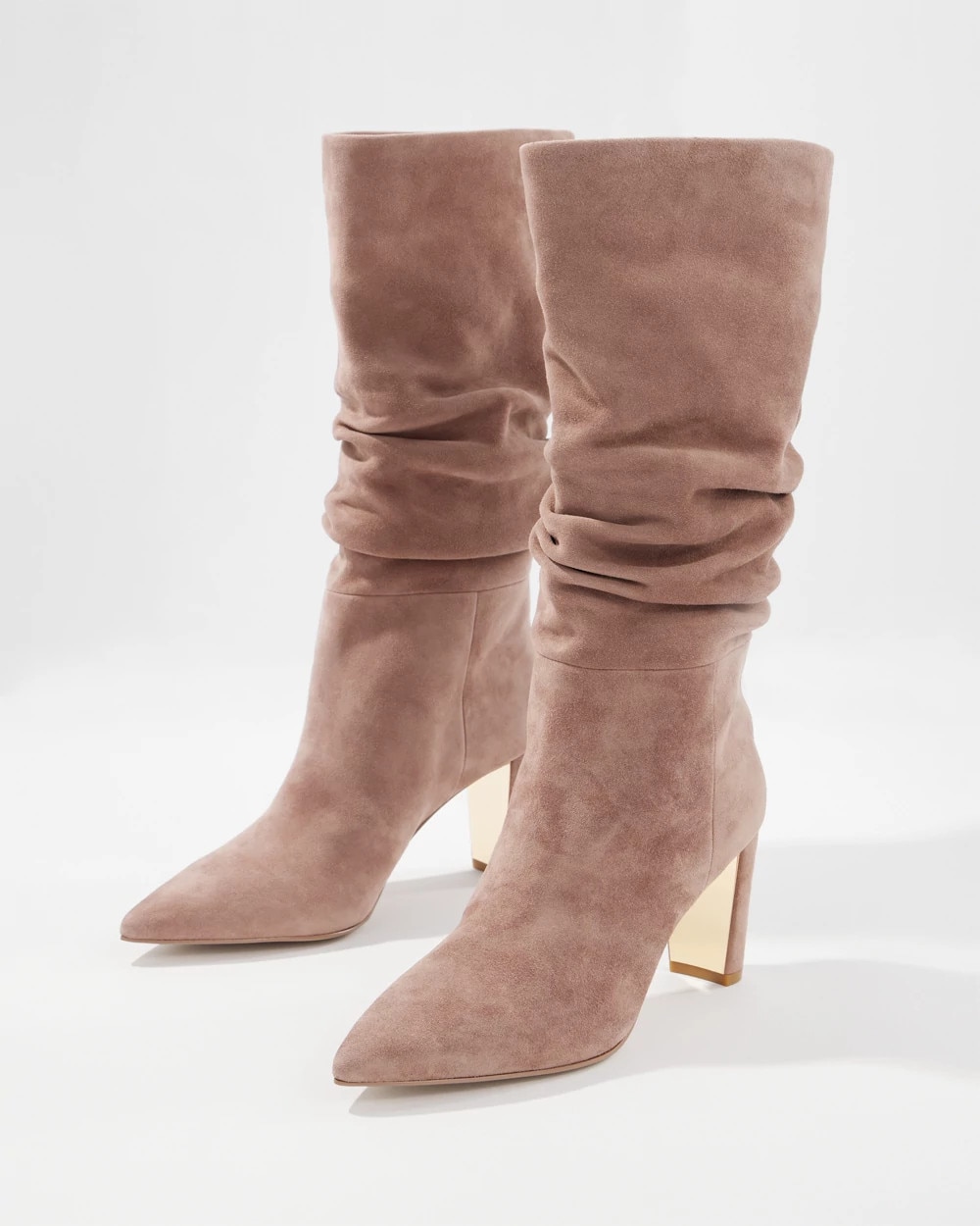 We took inspo from ‘80s fashion for these suede boots, giving them a slouchy look at the ankle that’s super chic. A flash of gold on the inner heel adds the finishing touch.