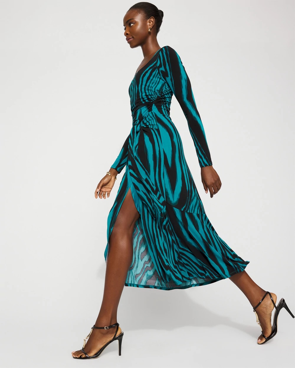 A functional side tie and ruching shapes this long-sleeve midi dress that will take you from desk to dinner.