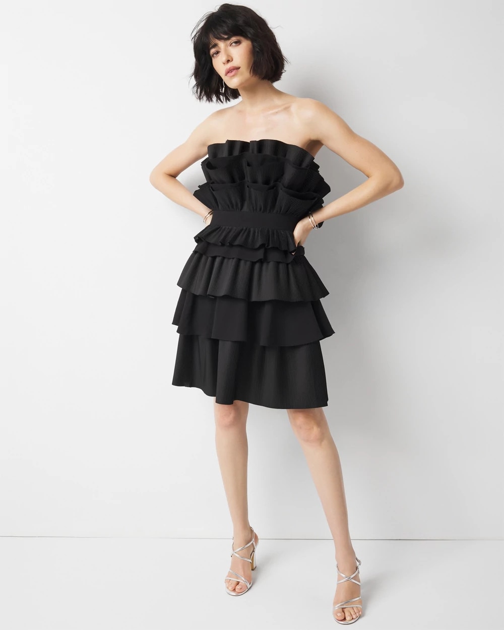 Party season is a breeze with this flirty little dress designed with tiered pleated ruffles and a waistband to create volume and a figure enhancing shape. The bustier has boning for structure and hold. Just as your favorite strappy heels and statement jewelry. An updo or sleek ponytail might be nice too.
