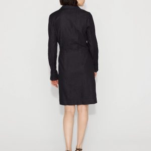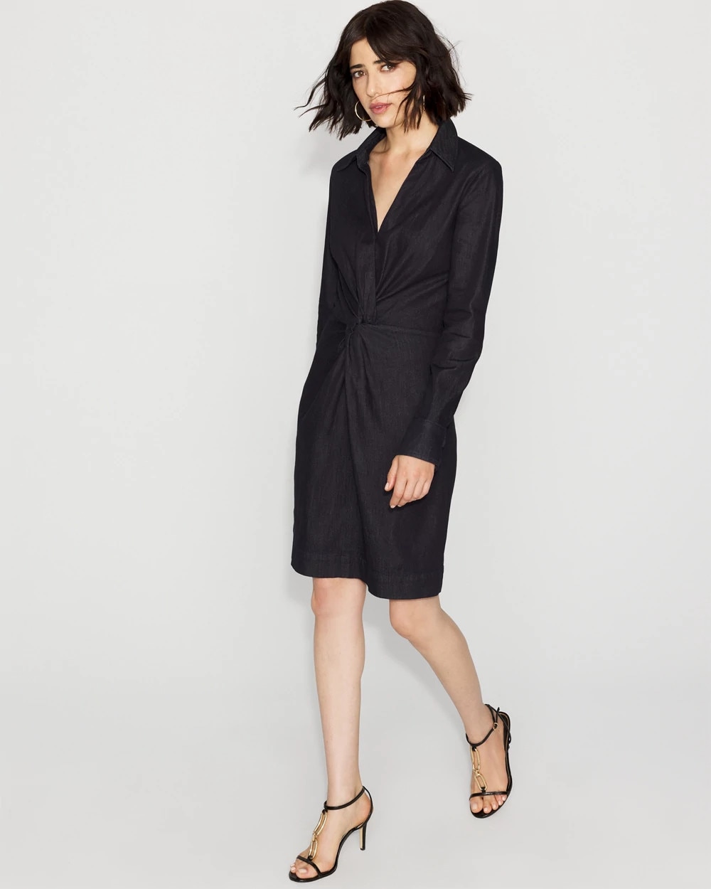 We’ve taken a classic shirt dress silhouette and transformed it into this short denim dress with a twist of fabric at the waist to shape you. A side zipper gets you in, but the two self-covered buttons at the cuffs allow you to roll up your sleeves.