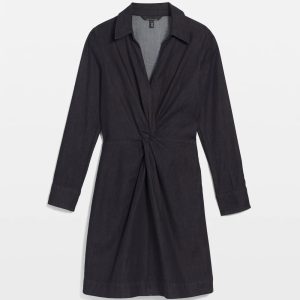 We’ve taken a classic shirt dress silhouette and transformed it into this short denim dress with a twist of fabric at the waist to shape you. A side zipper gets you in, but the two self-covered buttons at the cuffs allow you to roll up your sleeves.