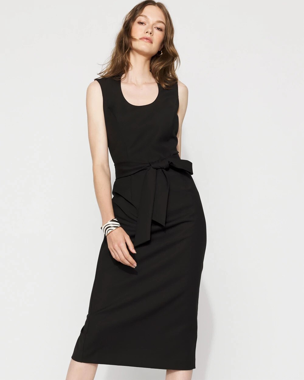 Sleek, smart and tailored to flatter. This sleeveless midi-length sheath is crafted in comfort stretch fabric with a waist-defining belt. The U-neckline offers a fresh take on a classic, while a back vent ensures it moves with you.