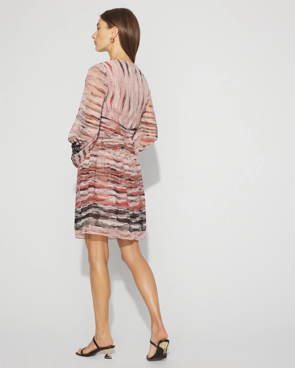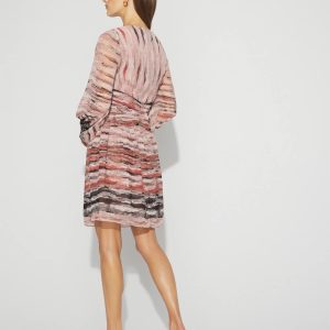 In a multi-colored print inspired by Italian designers, this timeless short dress has a waistband detail that defines you, while sheer sleeves and a pleated skirt add polish. Non-functioning covered buttons and elastic cuffs finish the look.