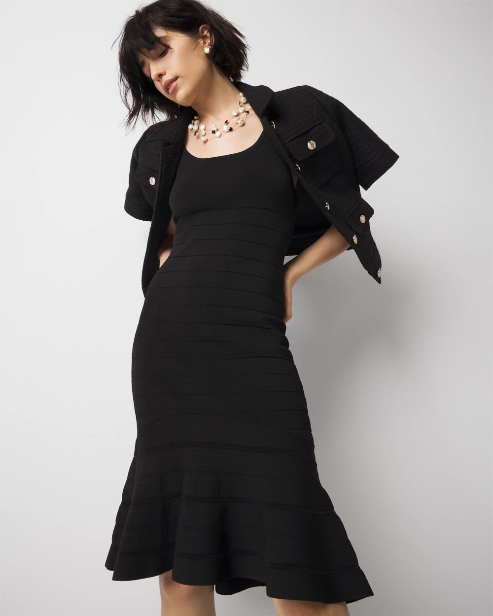 Meet our latest dress design in our WHBM FORME™ collection. This bodycon number has a flounce hem and sits just above the knee. An easy dress for layering under a blazer or jean jacket.