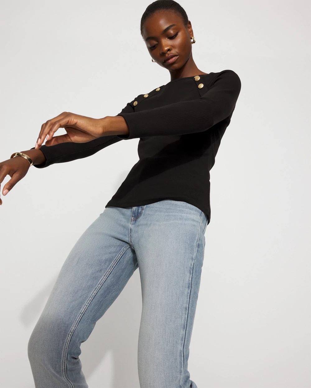 The perfect long-sleeve tee gets a style update with the addition of three gold shank buttons on each sleeve seam. Made with WHBM FORME™ Ribbed Stretch fabric that stretches and smooths your body, offering a flattering silhouette.