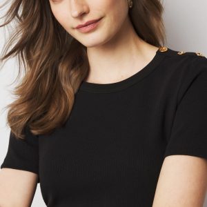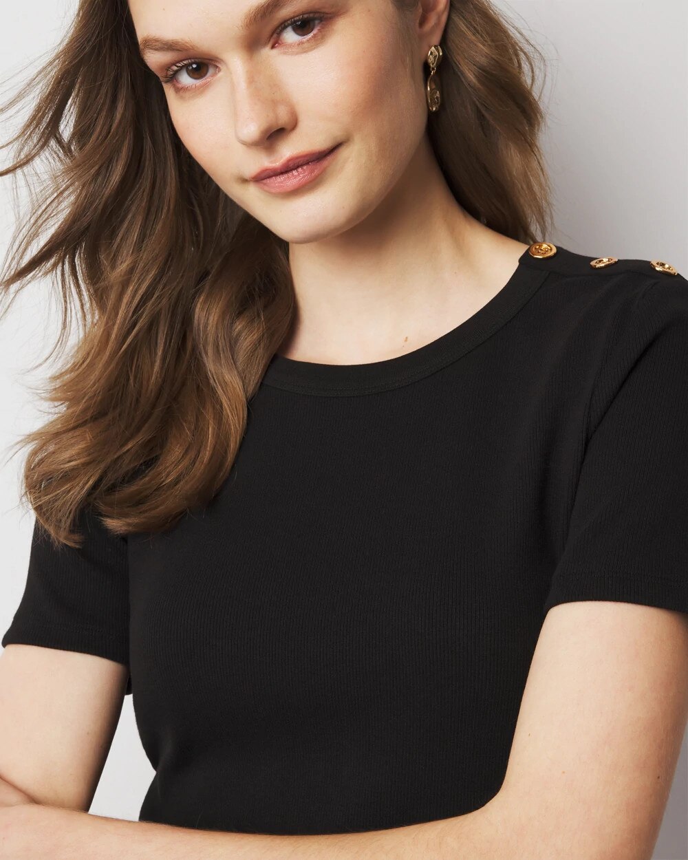 Part of our WHBM FORME™ Ribbed Stretch line-up, this short sleeve tee has three gold-toned buttons at the left shoulder and a ribbed material, making it one to love through all seasons. The comfortable crew neckline perfectly frames your face and collarbone. Wear it with denim and tailored trousers. Our ribbed fabric stretches and smooths your body, offering a flattering silhouette.