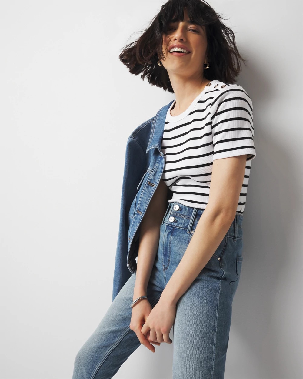 Part of our WHBM FORME™ Ribbed Stretch line-up, this short sleeve tee has three gold-toned buttons at the left shoulder and a ribbed material, making it one to love through all seasons. The comfortable crew neckline perfectly frames your face and collarbone. Wear it with denim and tailored trousers. Our ribbed fabric stretches and smooths your body, offering a flattering silhouette.
