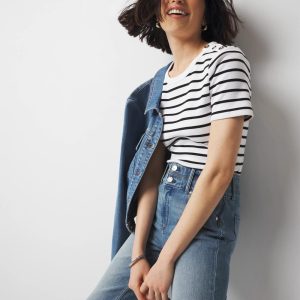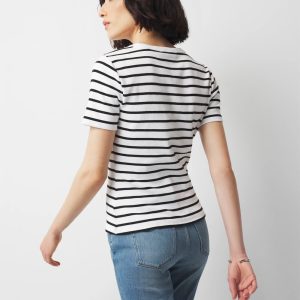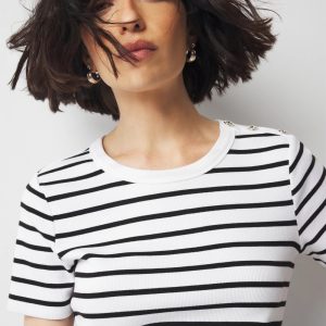 Part of our WHBM FORME™ Ribbed Stretch line-up, this short sleeve tee has three gold-toned buttons at the left shoulder and a ribbed material, making it one to love through all seasons. The comfortable crew neckline perfectly frames your face and collarbone. Wear it with denim and tailored trousers. Our ribbed fabric stretches and smooths your body, offering a flattering silhouette.