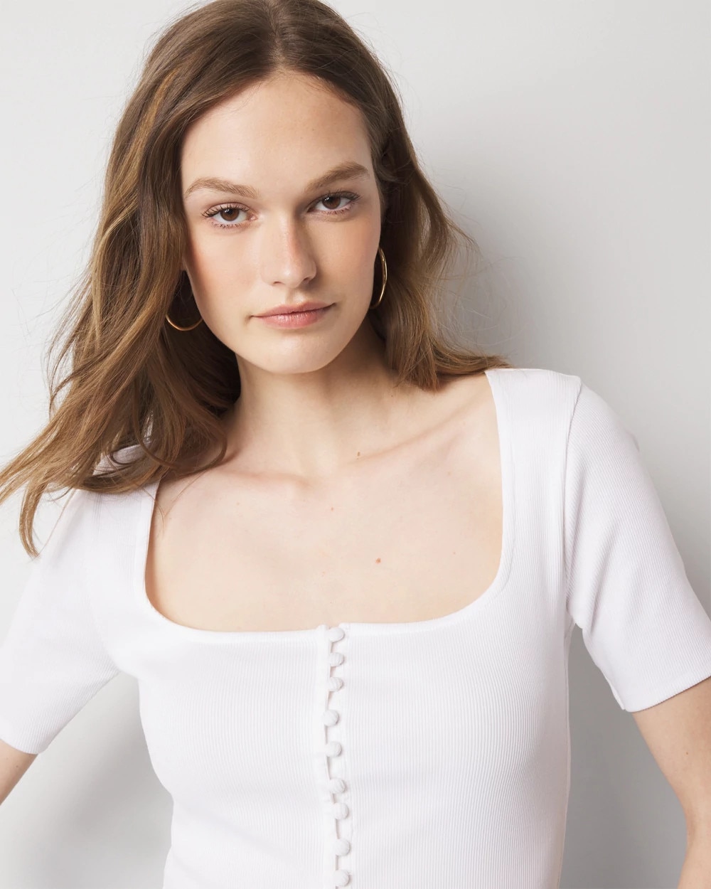 A new addition to WHBM FORME™ line-up, this short-sleeve tee has fully functional center front buttons and a flattering square scoop neckline. Our WHBM FORME™ ribbed fabric stretches and smooths your body, offering a flattering silhouette.