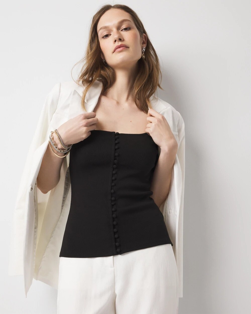 A new addition to WHBM FORME™ line-up, this short-sleeve tee has fully functional center front buttons and a flattering square scoop neckline. Our WHBM FORME™ ribbed fabric stretches and smooths your body, offering a flattering silhouette.