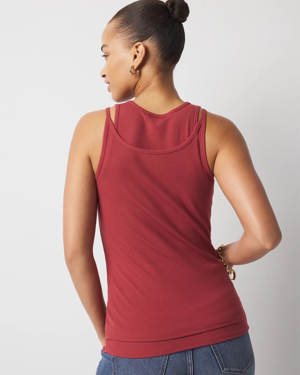 This layered tank top is the newest addition to our WHBM FORME™ collection and contains Tencel, a sustainable, lightweight and soft fabric. Designed as two attached tank tops in one for a layered effect, the bottom tank has a high neck, while the top tank has a scoop neckline. Our WHBM FORME™ ribbed fabric stretches and smooths your body, offering a flattering silhouette.