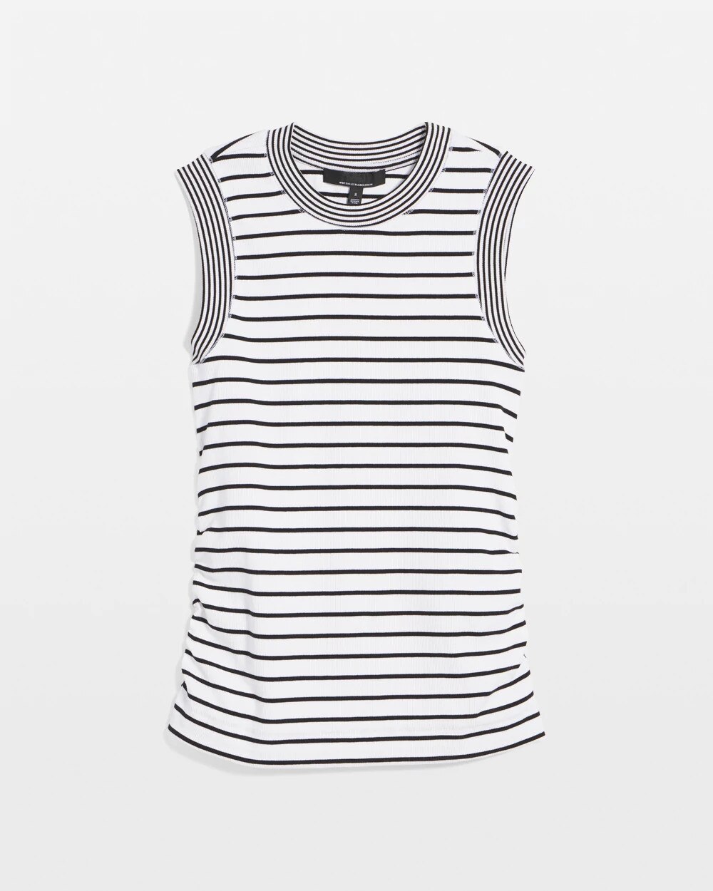 WHBM FORME™ Ribbed Stretch fabric stretches and smooths your body, offering a flattering silhouette. What also makes this crewneck tank stand apart is the ruching down the sides which gives it a hit of unexpected style. It’s finished with wide ribbed trim on neck and armholes. Wear it alone or layered under a jacket (but leave it unbuttoned so the ruching is visible.)
