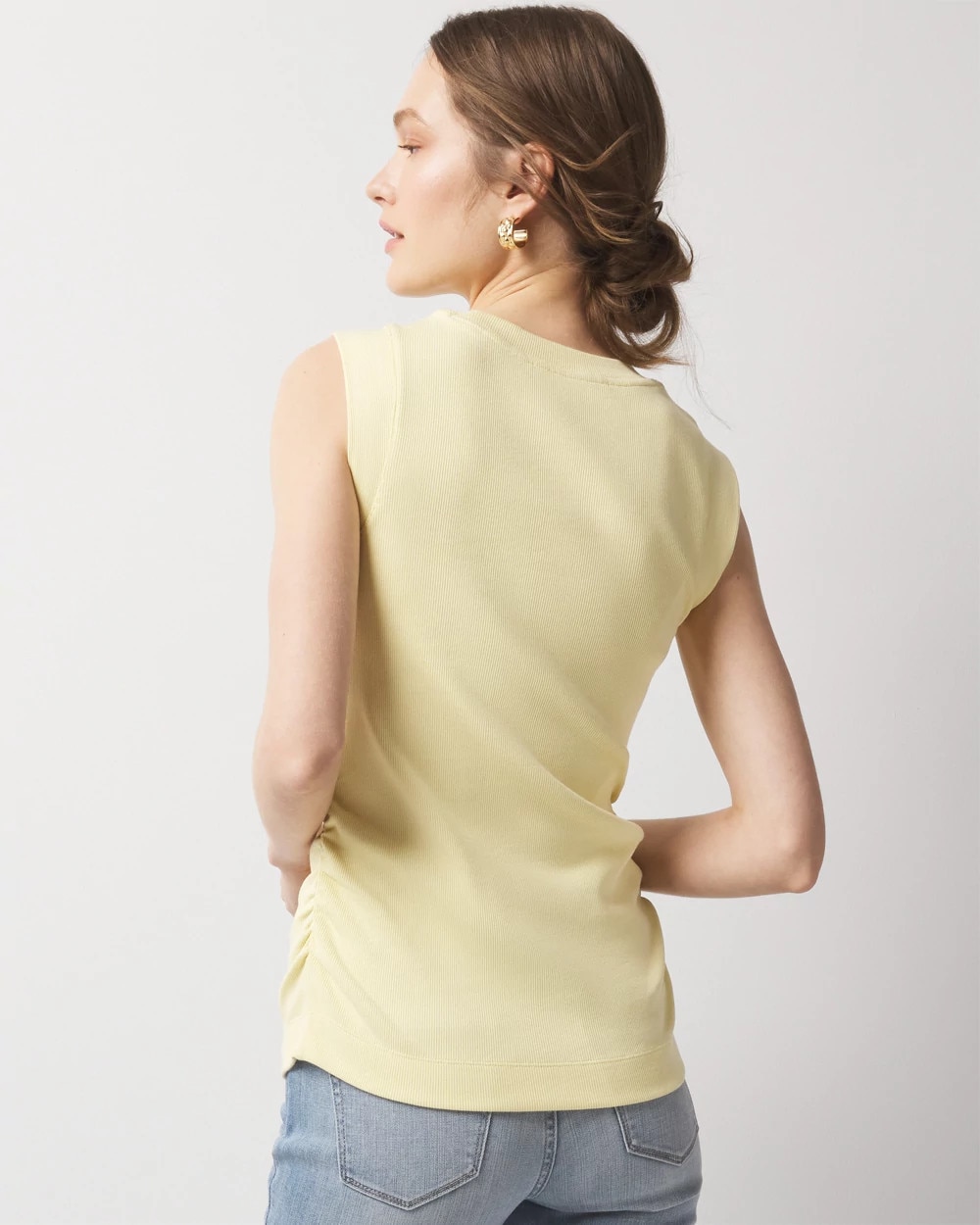 WHBM FORME™ Ribbed Stretch fabric stretches and smooths your body, offering a flattering silhouette. What also makes this crewneck tank stand apart is the ruching down the sides which gives it a hit of unexpected style. It’s finished with wide ribbed trim on neck and armholes. Wear it alone or layered under a jacket (but leave it unbuttoned so the ruching is visible.)