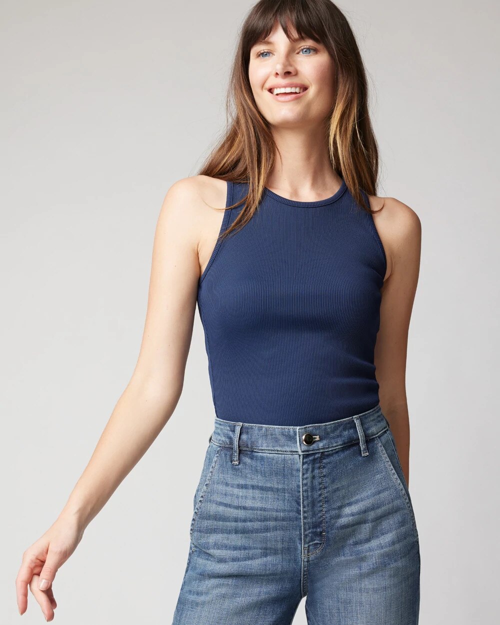 WHBM FORME™ has softened the iconic tank top by designing a version in our ribbed fabric that stretches and smooths your body, offering a flattering silhouette. Fitted for wear on its own or as a layering piece.