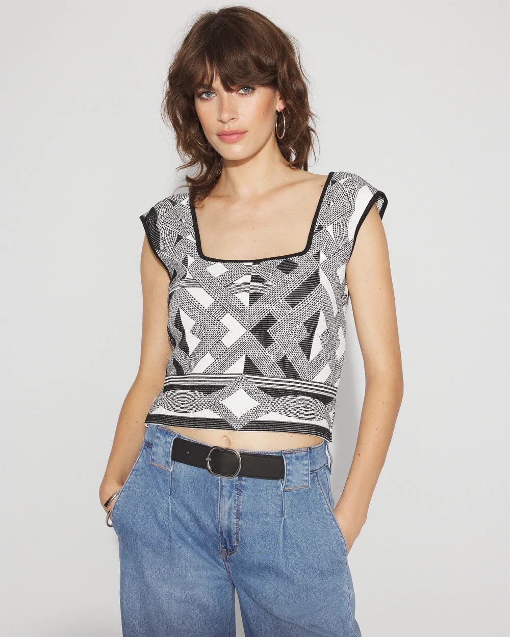 A textured jacquard tank top with a bold geometric pattern that is part of our WHBM FORME™ Sculpt Stretch collection, giving you unparalleled fit that conforms closely to the body and lets you move comfortably. Pair this cropped tank with its matching Geometric Jacquard Sweater Skirt for a full look.