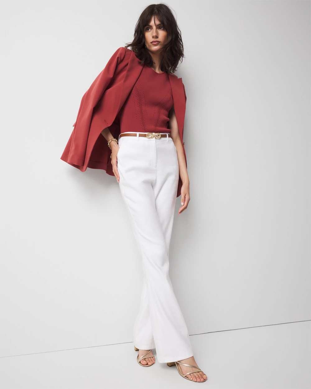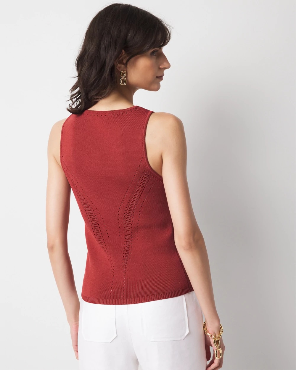Our WHBM FORME™ Sculpt Stretch sweater tank has variegated pointelle stitch details that flatters your shape as well as a ribbed bottom. Sculpt stretch fabric gives you an unparalleled fit that conforms closely to the body and lets you move comfortably. Wear under a jacket on cool days or under a blazer for the office.