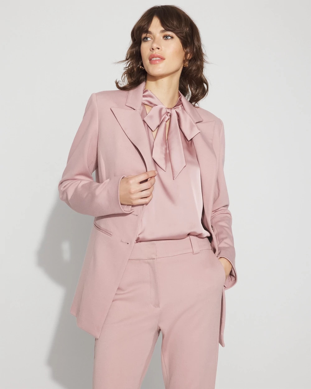Our new WHBM® Two-Button Blazer has a longer length, front welt pockets and seaming details to shape you. Two silver hammered buttons in front add shine, while the functional button cuffs allow you to roll up the sleeves for styling options. Pair with our matching WHBM® Blake Bootcut Pant for a chic suit.