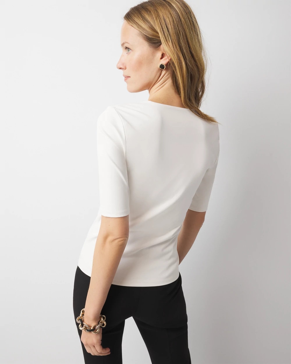 Our collection of WHBMFORME™ All Ways Stretch fashion tees provide flexibility and movement with a fabric that stretches in all directions. This classic V-neck tee with elbow sleeves will quickly become your go-to top this spring.
