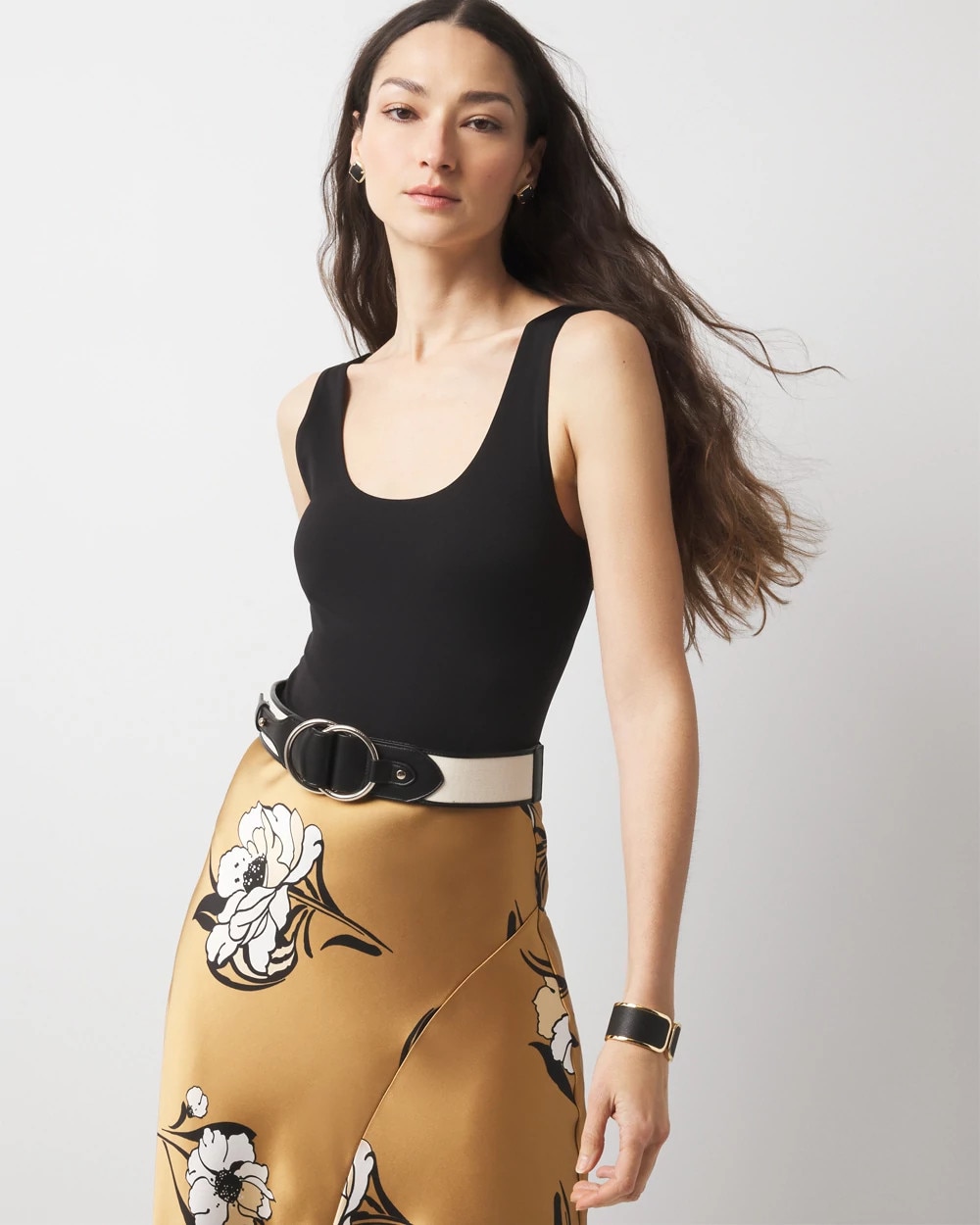 A bodysuit is a stylist’s dream, and it will quickly become yours once you slip it on and get the sleek, sexy look that’s also polished. Wear it with high-waist jeans and pants under a blazer or on its own. This bodysuit will also rock your look when paired with a skirt. Our collection of WHBMFORME™ All Ways Stretch fashion tees provide flexibility and movement with a fabric that stretches in all directions.