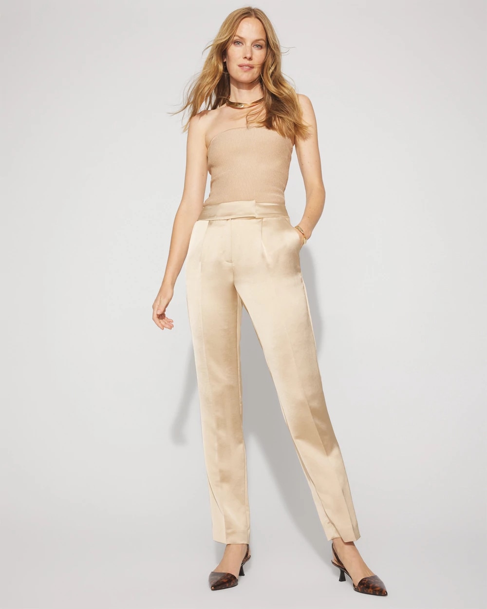 This satin edition of our new Zoey Straight Pant is designed to give you dressed-up style at the office + after work. We’ve added an extended tab at the waist for a smooth finish as well as front pleats and back darts.